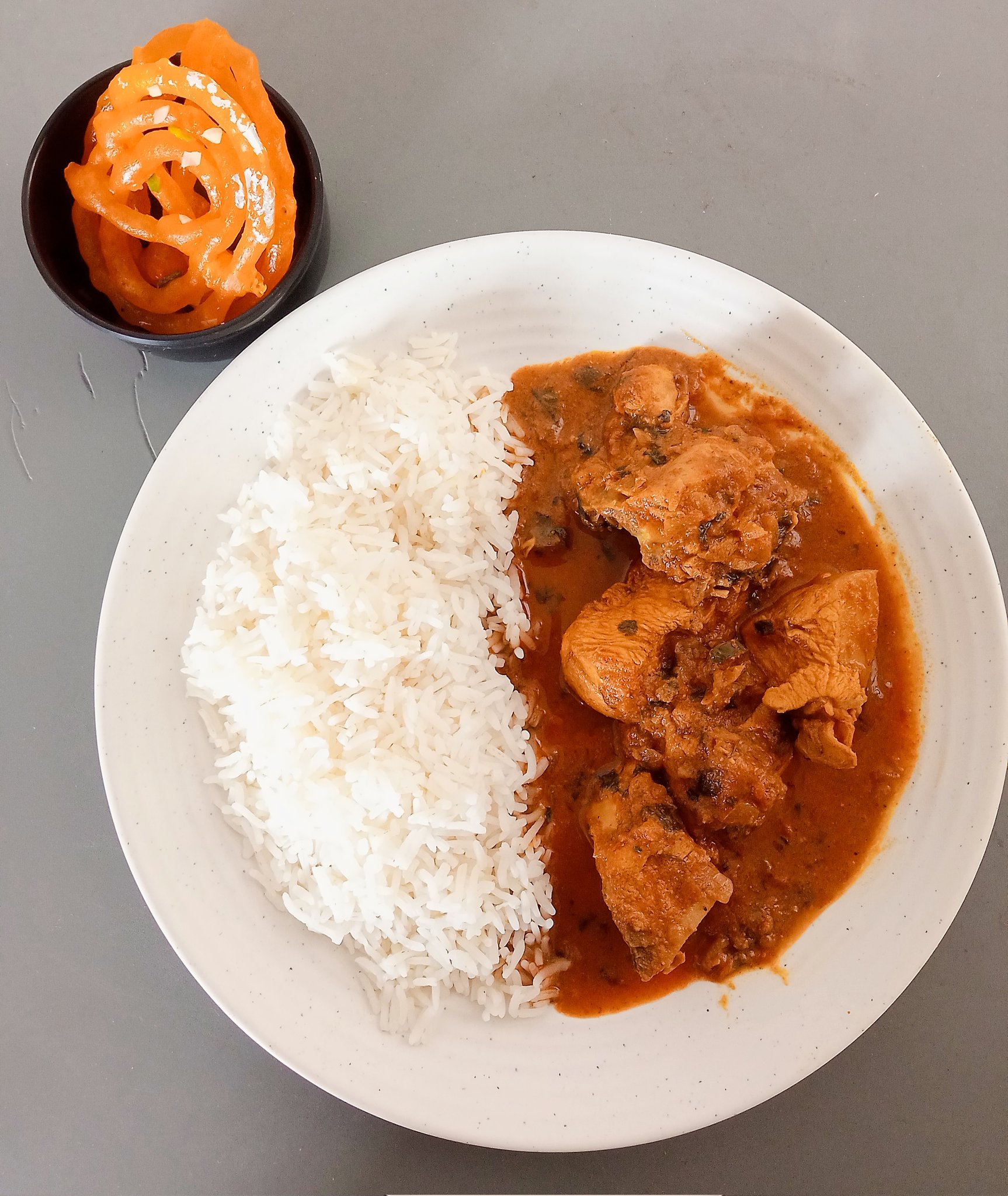 Chicken curry with rice and jalebis