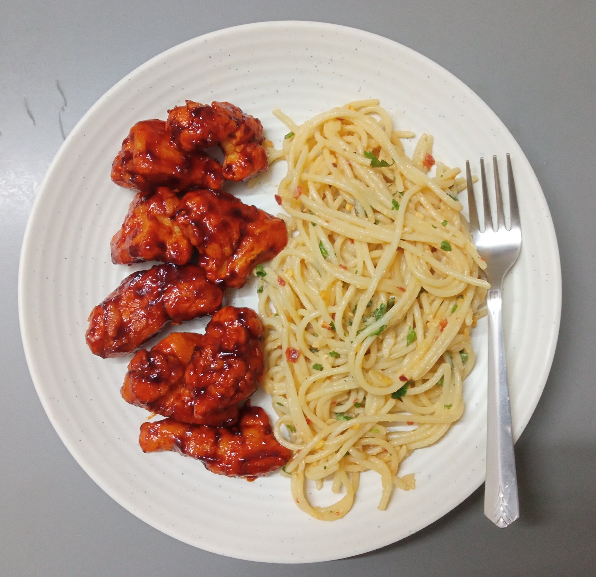 Spaghetti with Korean fried chicken